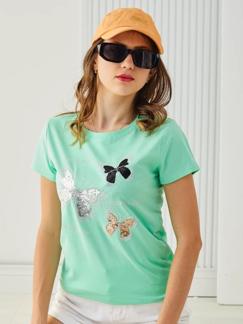 • Оригинальная женская блузка с круглым вырезом, выполненная из мягкой и приятной на ощупь ткани. Вся модель украшена яркими пайетками, а короткие рукава придают легкость. Идеальный выбор для создания модных и стильных образов!