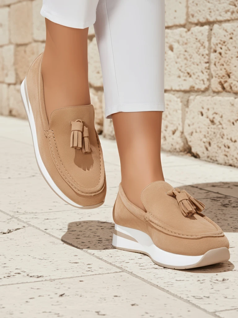 Женские лоферы Callista бежевые на танкетке с бахромой, эко-замша