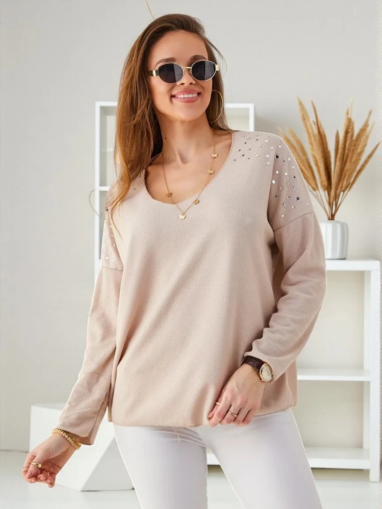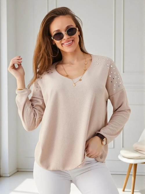 • Женский свитер с V-образным вырезом из приятной ткани. Модель имеет длинные рукава. Она украшена стразами на плечах. Идеальная основа для зимних образов!