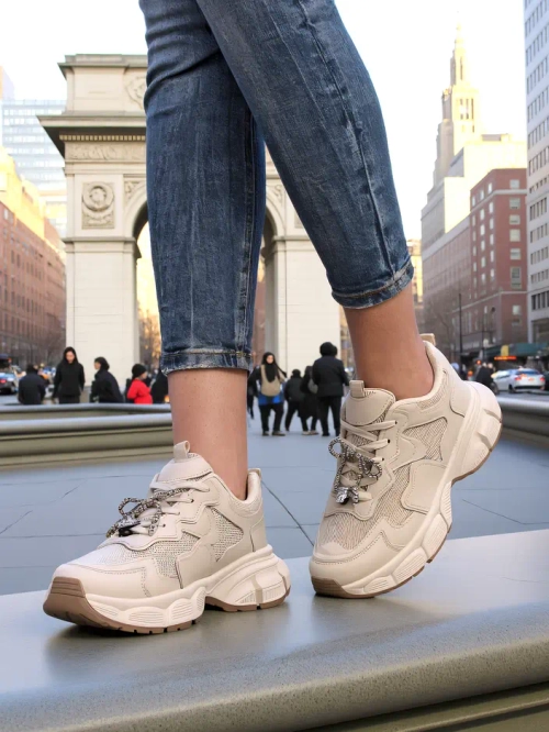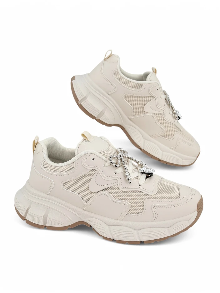 • Женские спортивные туфли из экостойкой кожи и сетки. Модель на толстой подошве. Зашнурованная верхняя часть. Они идеально подойдут к повседневной одежде! Украшены съемной цепочкой.