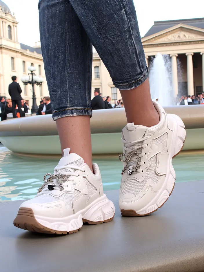 • Женские спортивные туфли из экокожи и сетки. Модель на толстой подошве. С шнуровкой. Отлично подойдут к повседневным нарядам! Украшены съемной цепочкой.