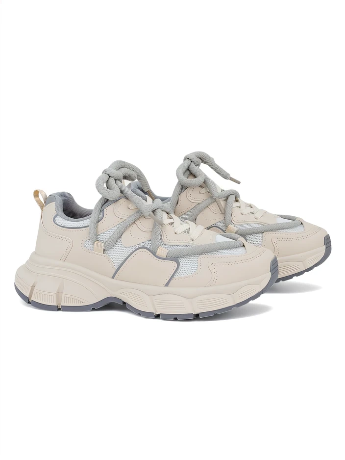 - Женские спортивные туфли из эко-кожи и сетки. Модель с более толстой подошвой. Затяжка на верху. Они отлично подойдут к повседневным нарядам!
