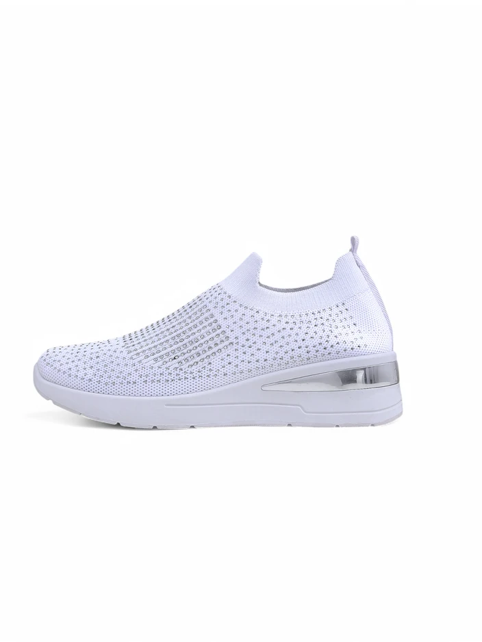 - Модные женские кроссовки на танкетке из ткани, украшенные стразами. С мягкой текстильной стелькой. Обувь без застежки. Они станут отличным украшением для повседневных образов.