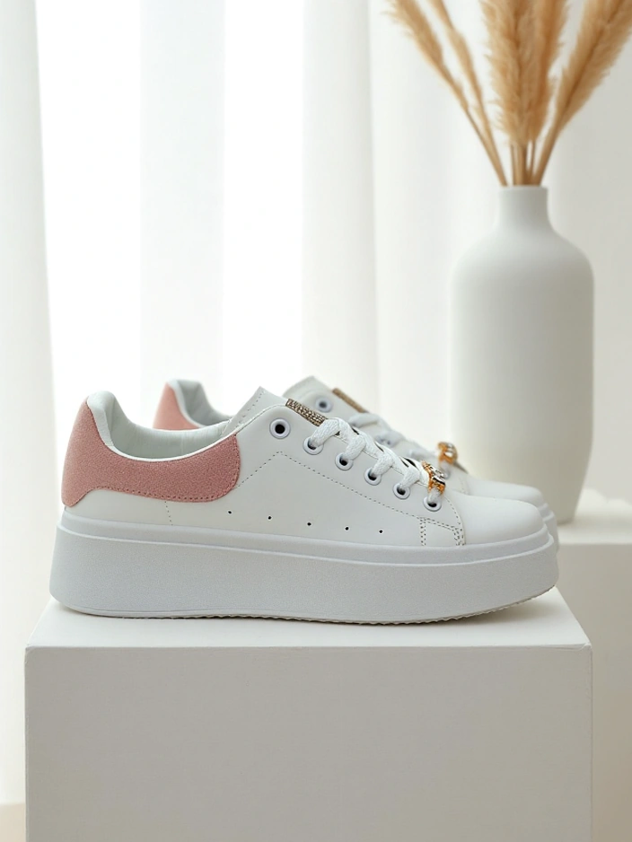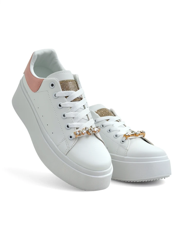 • Элегантные белые кроссовки с мерцающим металлическим элементом. Обувь из экокожи и тканевых вставок. Идеально подходит для повседневной одежды.