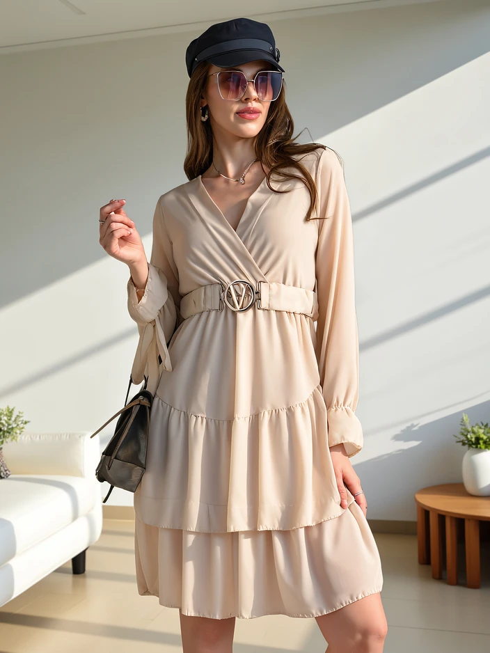 - Женское мини-платье с рюшами. Модель с длинными рукавами, запахом и эластичной лентой и поясом на талии. Обязательная вещь в вашем гардеробе!