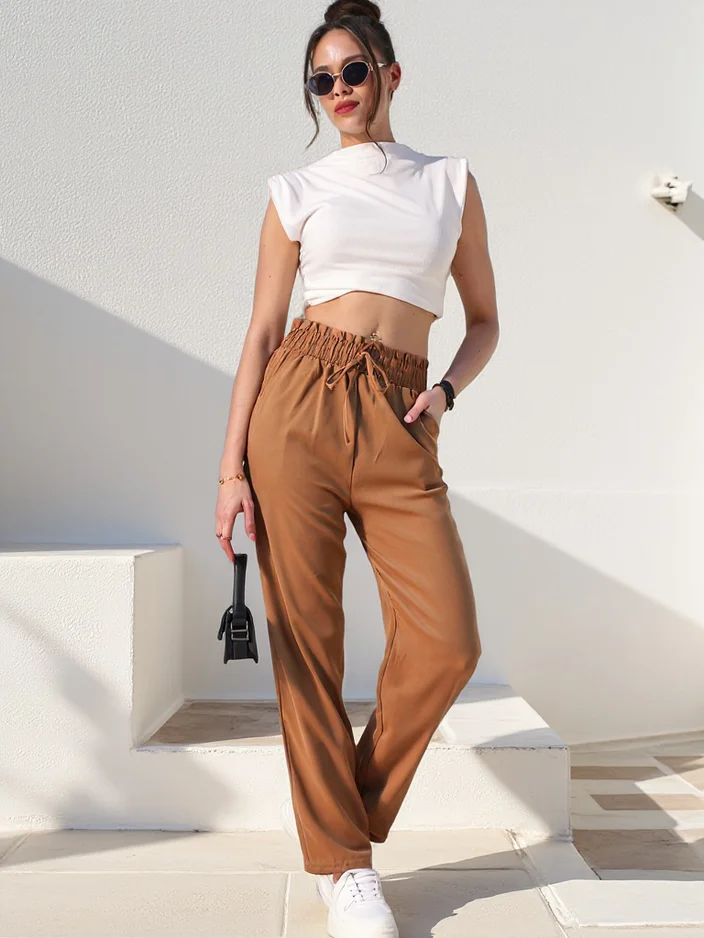 - Широкие брюки из легкой ткани, модель с эластичным поясом и двумя карманами. Удобно и уютно! ПРИМЕЧАНИЕ: Точность измерений (+/-) 1 см.