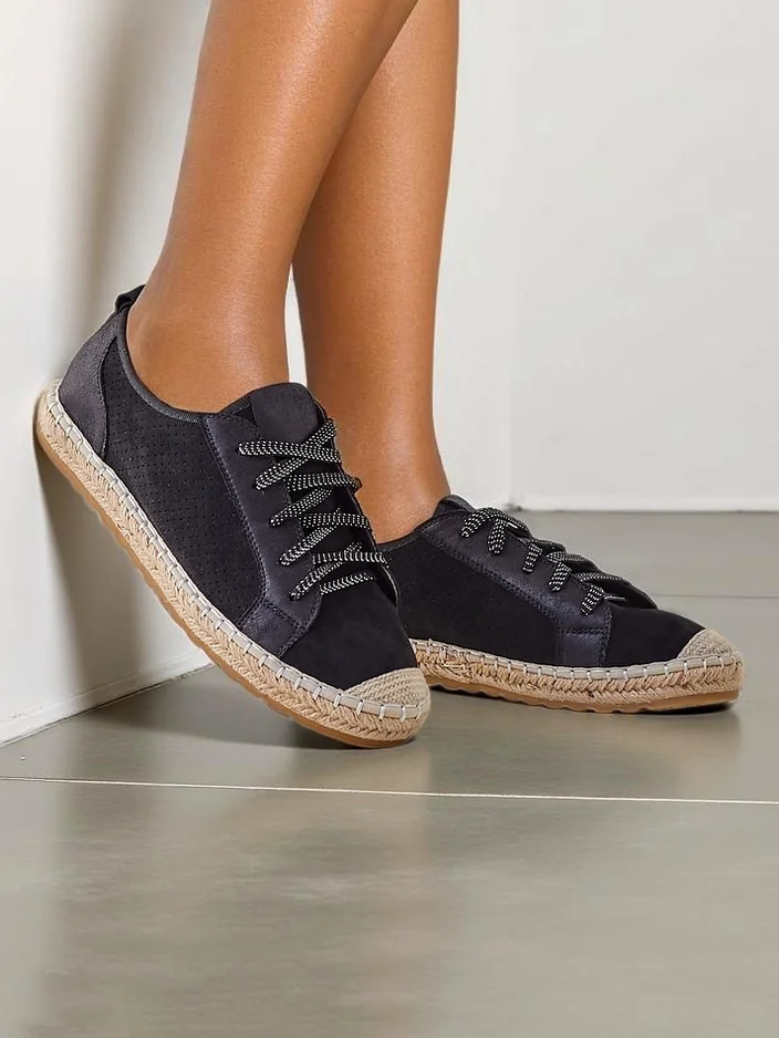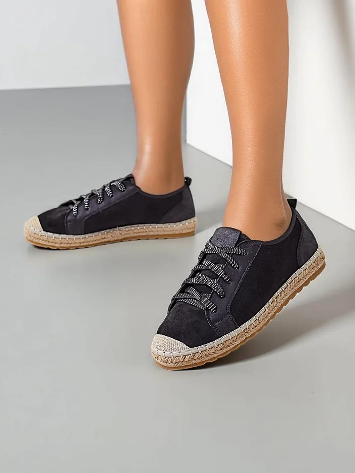 - Женские кроссовки на плоской подошве. Эта пара в повседневном стиле выполнена из эко-замши, с текстильной стелькой. Модель отличается подошвой, украшенной джутовым шнуром. Идеально для тех, кто ценит комфорт!