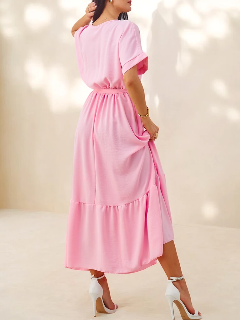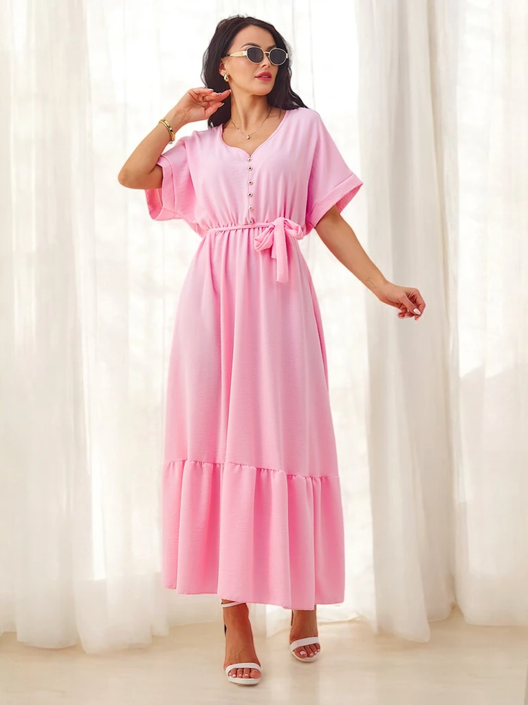 - Женское миди-платье с короткими рукавами, декоративными пуговками, поясом и V-образным вырезом - это элегантный и женственный вариант для любого случая. Оно подчеркивает силуэт, сочетая классический крой с модными деталями.