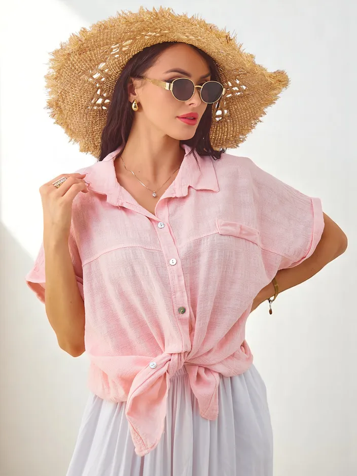 - Рубашка женская из хлопка с тиснением и короткими рукавами. Модель с V-образным вырезом, застежка на пуговицы. Невозможный предмет в гардеробе каждой женщины!
