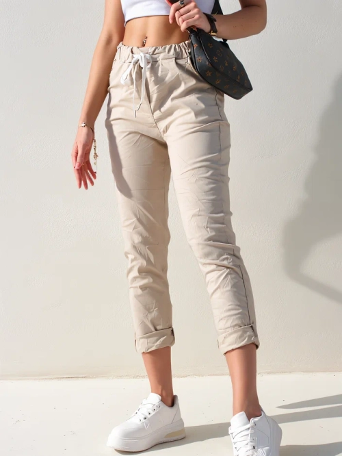 - Феноменальные зауженные брюки из легкой ткани, модель имеет эластичный пояс и шнурки. Кроме того, в ней есть 2 кармана. Хит сезона! ПРИМЕЧАНИЕ: Точность измерений (+/-) 1 см.