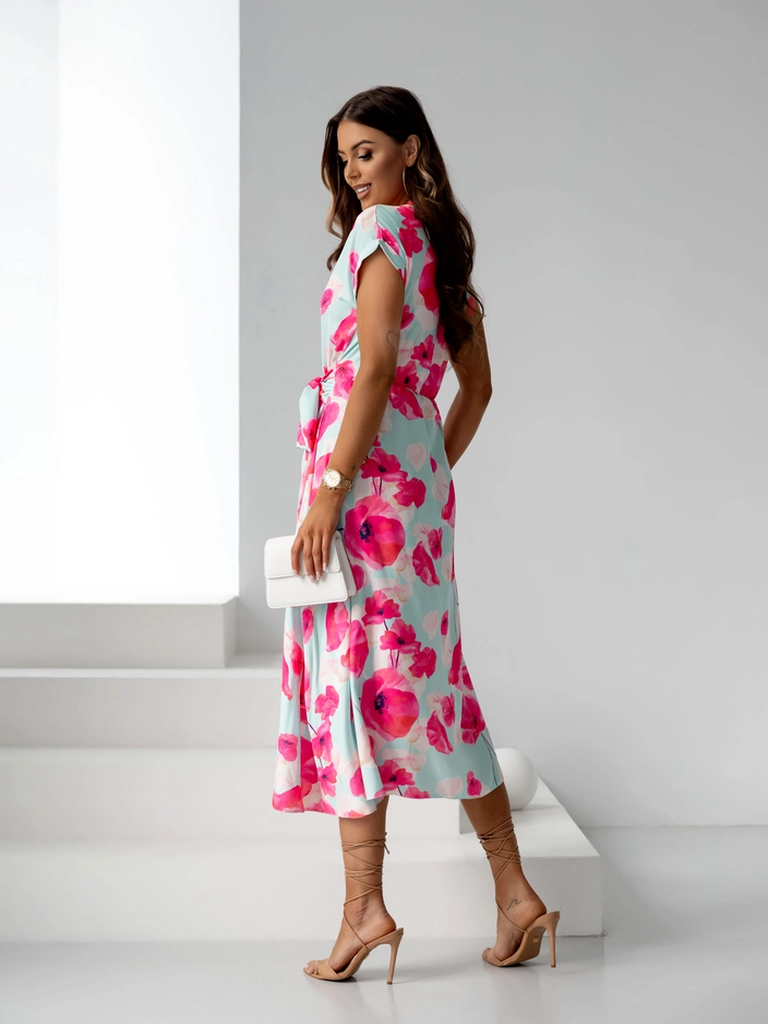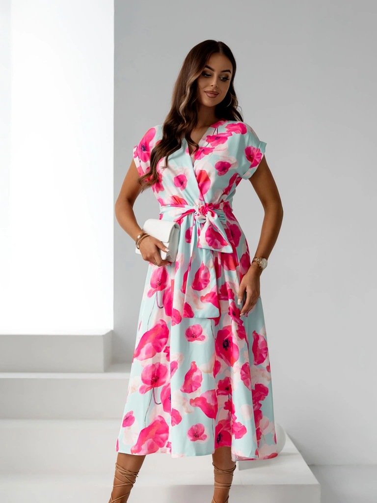 - Женское миди-платье с короткими рукавами и завязкой на груди, украшенное весенними цветами – легкое, элегантное и идеально подходит для теплых дней.