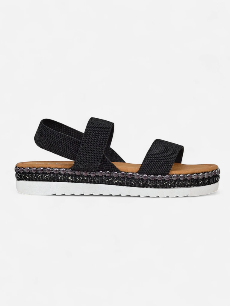- Женские сандалии на низкой подошве - идеальный выбор для жарких летних дней. Модель выполнена из ткани и эко-кожи. Подошва украшена декоративными шпильками. Обувь без застежки. Сочетание стиля и комфорта!