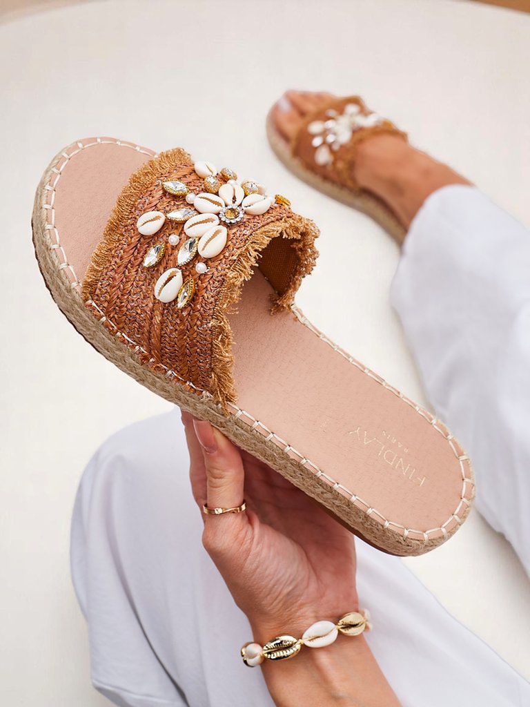 • Женские шлепанцы с ракушками, изготовленные из ткани, стельки из экокожи и подошвы, украшенной джутовым шнурком – стиль и комфорт на лето.