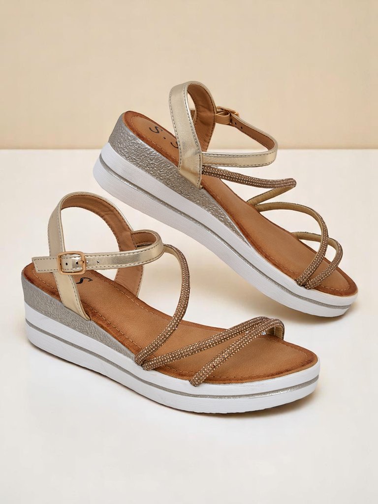 - Откройте для себя элегантность этих сандалий. Поразительные на танкетке, украшенные сверкающими стразами, они идеально подчёркивают летнее сияние. Сочетание комфорта и роскошного внешнего вида – идеально подходят для любого особого случая!