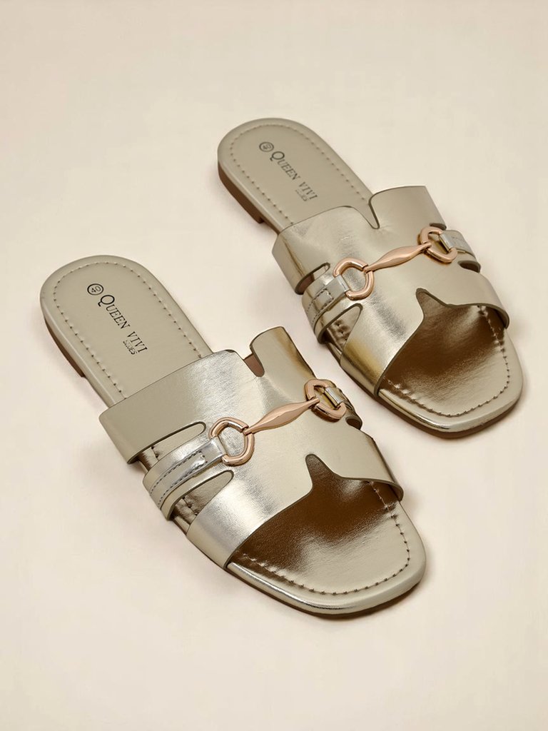 - Тапочки из экологически чистой кожи, украшенные изящным золотым декоративным элементом. Элегантная простота и комфорт, которые подойдут к любому летнему образу.