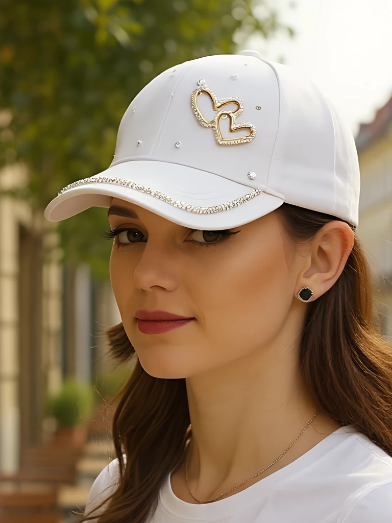 • Женственная кепка, украшенная стразами в форме сердец. Стильная, удобная и регулируемая. Добавляет блеска как повседневным, так и особым образам!