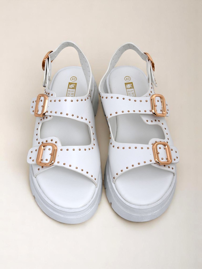 - Женские сандалии из экокожи на толстой подошве, украшенные блестящими стразами. Застегиваются на пряжку, сочетают в себе комфорт и выразительный, современный стиль.