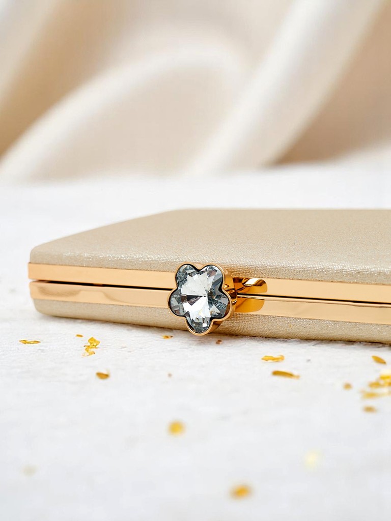 - Элегантный клатч из экокожи, покрытый тканью с блестящей нитью и изысканным тиснением. Застегивается на кнопку, со съемной цепочкой — блеск для любого случая.