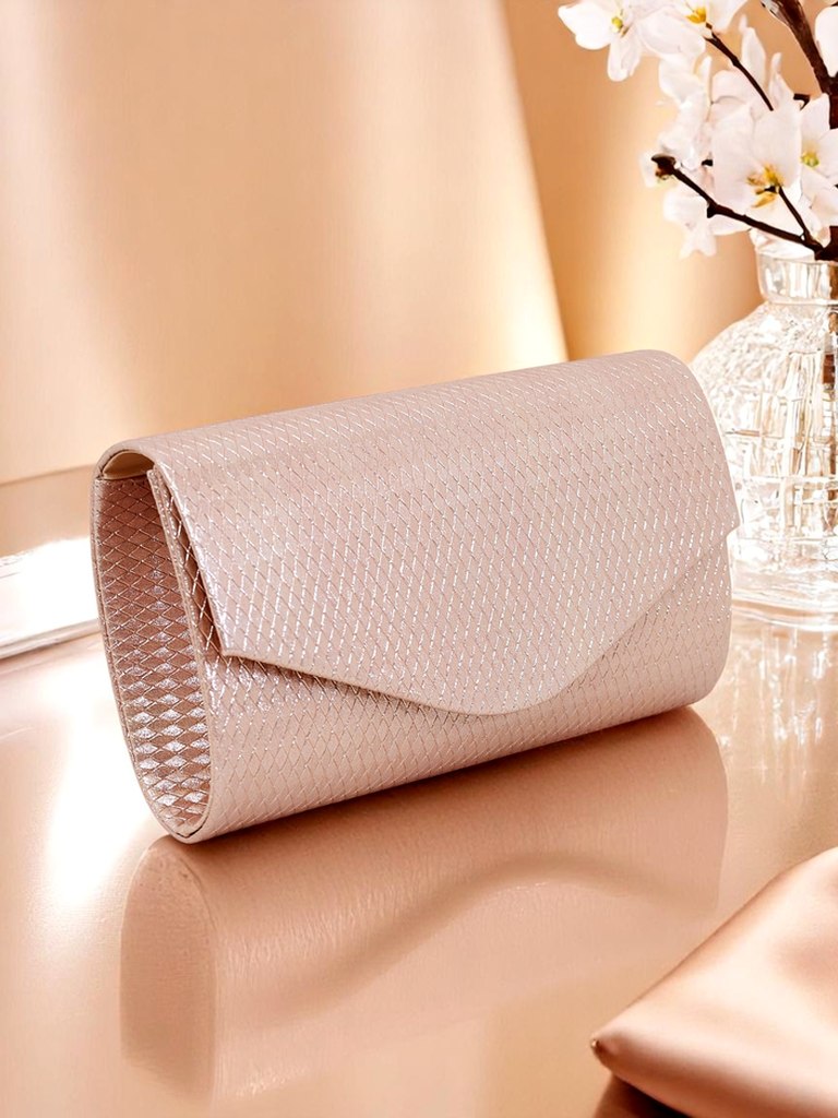 - Сумка-конверт из экокожи, покрытая тканью с мерцающей нитью и деликатным тиснением. Застегивается на магнит, с отсоединяемым ремешком — элегантность в блестящем исполнении.