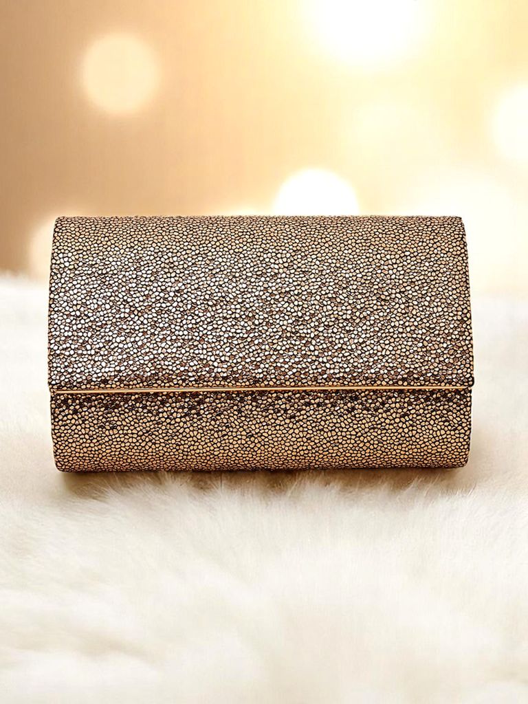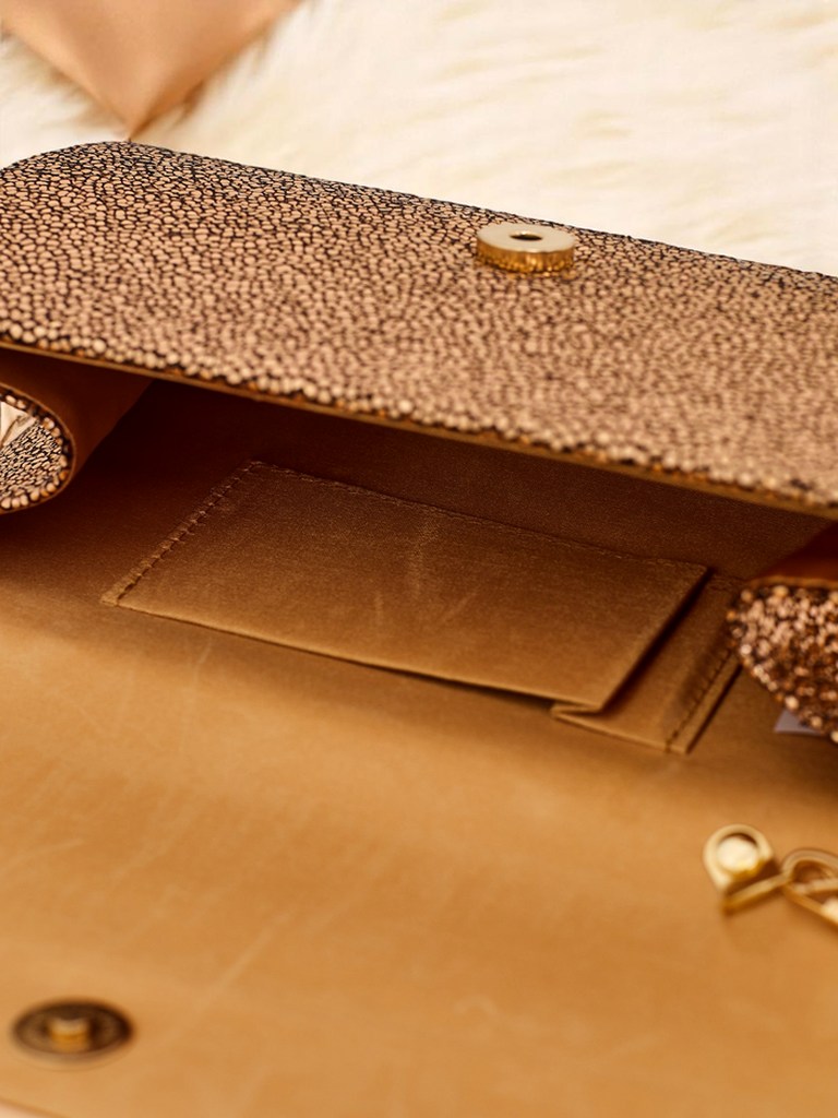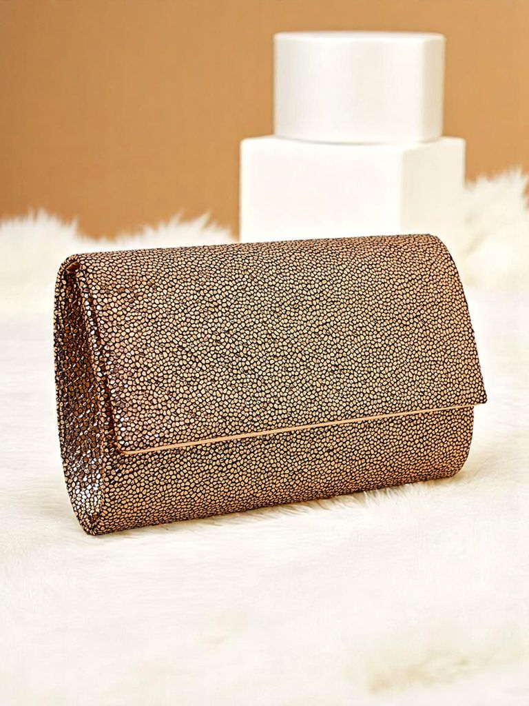 - Стильный клатч из экокожи, покрытый плотной блестящей тканью. Застегивается на магнит, с съемным ремешком — идеально подходит для вечерних выходов и особых случаев.