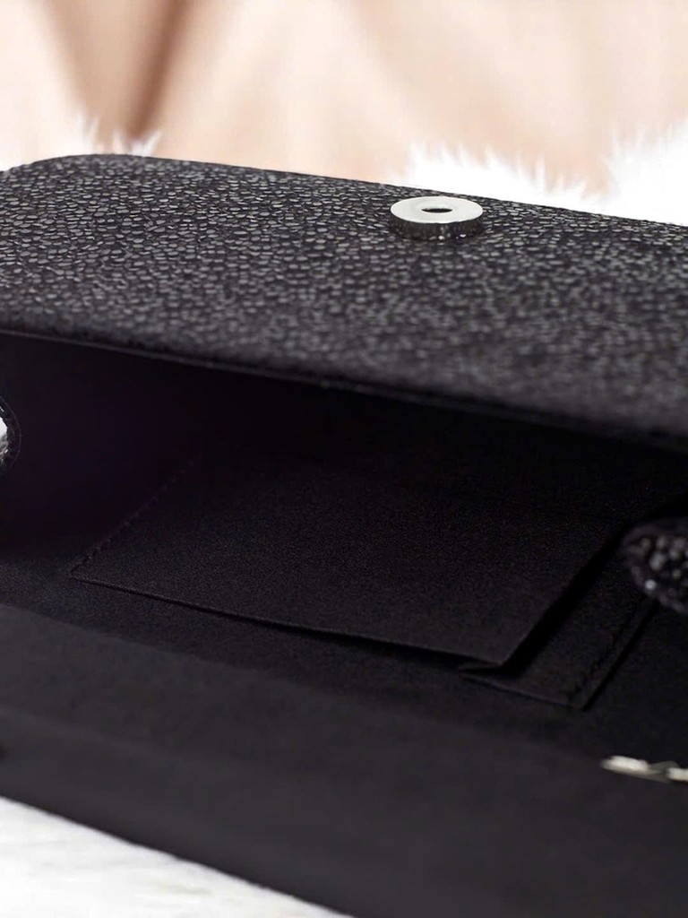 - Стильный клатч из экокожи, покрытый плотной блестящей тканью. Застегивается на магнит, с съемным ремешком — идеально подходит для вечерних выходов и особых случаев.