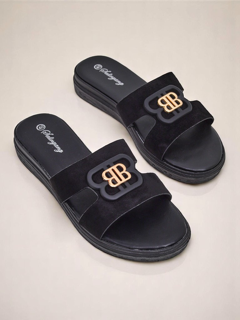 • Стильные плоские шлепанцы из эко-замши со стелькой из эко-кожи. Носок украшен элегантной пластиковой аппликацией. Комфорт и шик, идеально подходящие для летних дней.