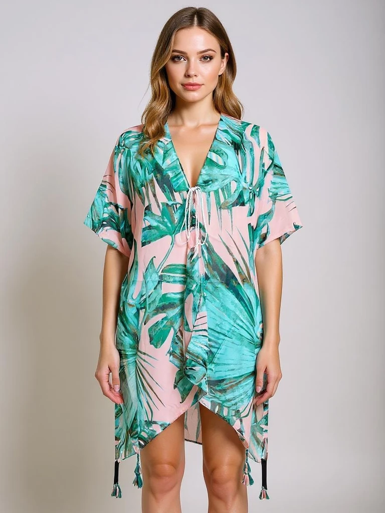 - Летняя пляжная туника-парео с V-образным вырезом и асимметричным низом – стильный must-have для отпуска. Легкая, воздушная ткань и эффектный узор подчеркивают женственность, а свободный крой обеспечивает комфорт в жаркие дни. Идеально подходит для пляжа и