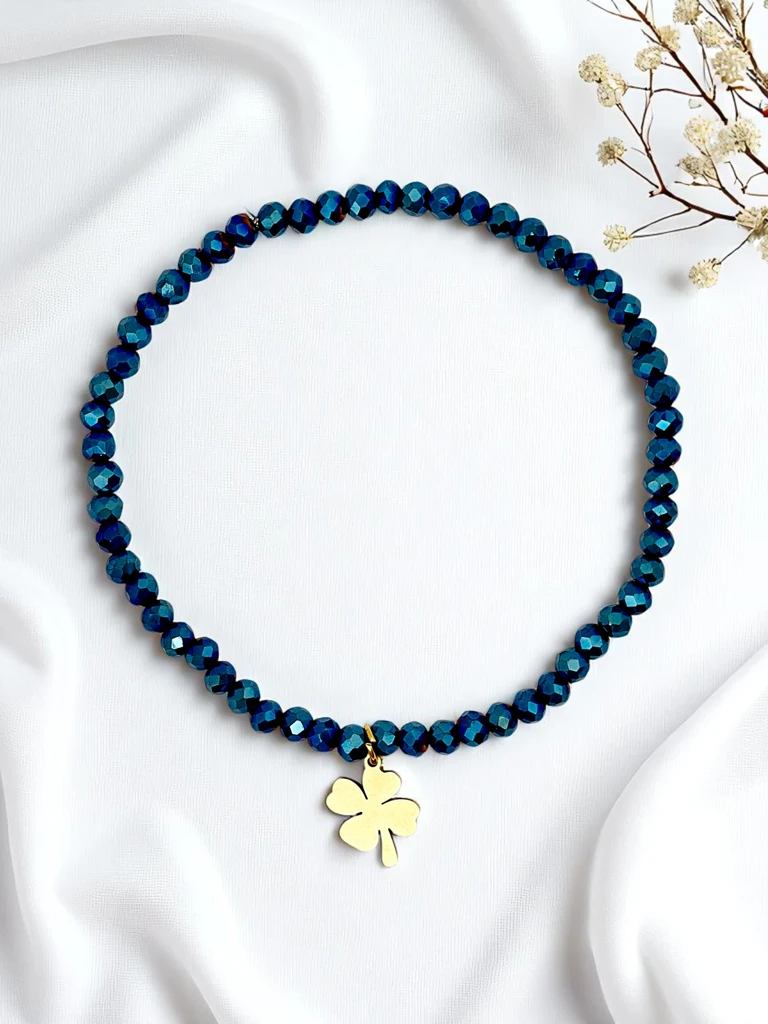 - Браслет с бусинами и подвеской в форме клевера — стильный талисман удачи. Изящный и элегантный, он символизирует счастье, надежду и позитивную энергию. Идеально подходит для повседневной носки как ненавязчивый аксессуар с уникальным посланием.