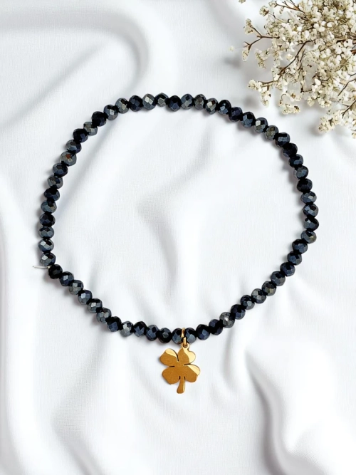 • Браслет с бусинами и подвеской в форме клевера — стильный талисман удачи. Изящный и элегантный, он символизирует счастье, надежду и позитивную энергию. Идеально подходит для повседневной носки как ненавязчивый аксессуар с уникальным посланием.