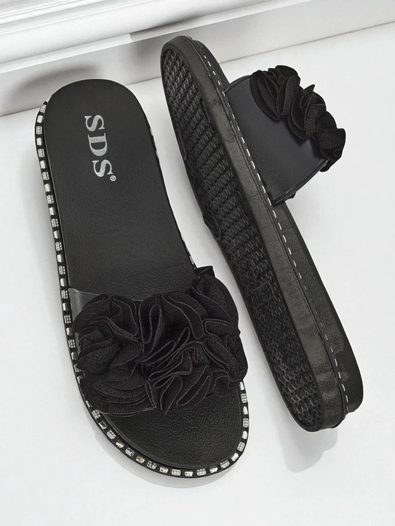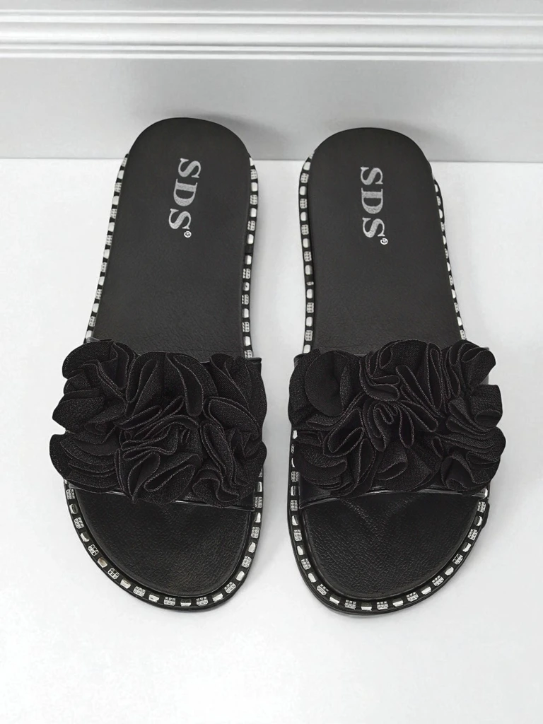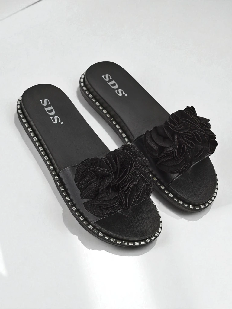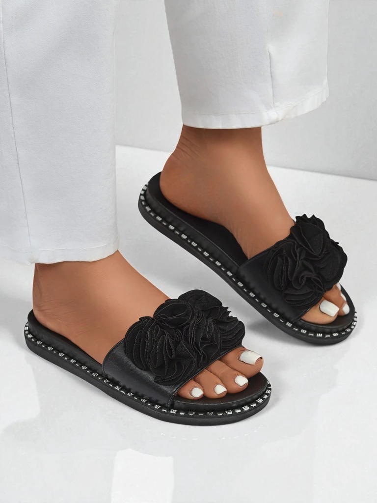 • Женские шлёпанцы из экокожи с модным цветочным украшением. Лёгкий, удобный и стильный вариант для лета – экологичная элегантность на каждый день!