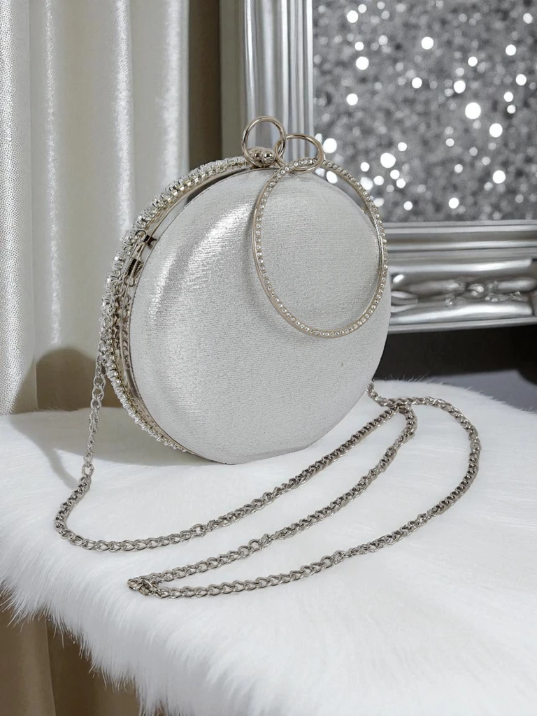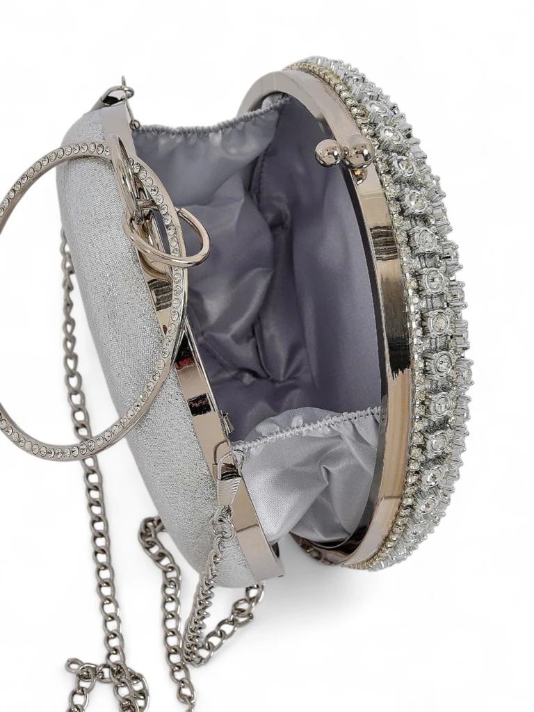 • Круглый клатч с замысловато украшенной цирконами поверхностью. Цепочка позволяет носить его на плече. Элегантный, выразительный и созданный, чтобы сиять в темноте.