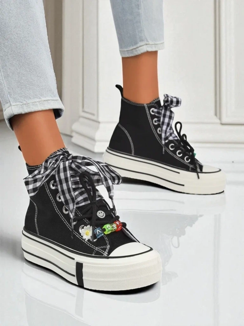 • Модные тканевые кеды на толстой подошве. Украшены разноцветными шнурками и бусинами. Удобные, легкие и стильные – идеально подходят для городских образов и повседневной носки. Комфорт и тренд в одном шаге.