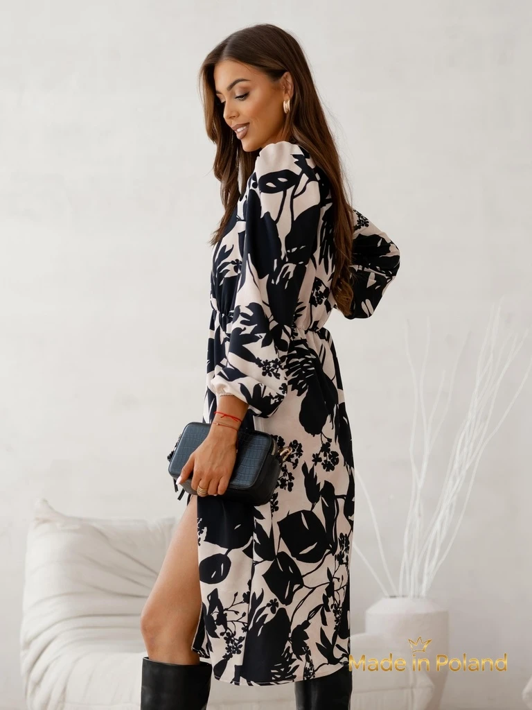 Откройте для себя уникальное платье Melania Botanica – сочетание вневременной элегантности и новейших модных тенденций. Изготовлено из высококачественной ткани, состоящей из 65% полиэстера и 35% вискозы, что гарантирует не только долговечность, но и комфорт при ношении. Легкая, дышащая смесь материалов разработана с учетом комфорта, оставаясь мягкой на ощупь и приятной для кожи. В процессе производства использовались современные методы цифровой печати, которые обеспечивают выразительный и стойкий ботанический узор в оттенках коричневого, являющийся must-have этой осени. Платье имеет длину миди, доходящую до середины икры, что придает силуэту гармонию и утонченность. Длинный рукав с легкой сборкой подчеркивает элегантный характер, а декольте с практичной застежкой на липучке делает надевание быстрым и удобным. Талия подчеркнута легкой перевязкой, которая подчеркивает женскую фигуру и придает образу легкость. Особенности и преимущества: - Исключительный комфорт благодаря дышащей ткани с вискозой. - Долговечность и простота в уходе (полиэстер не мнется и не теряет форму). - Универсальный, стильный ботанический узор, идеально подходящий для повседневной носки и особых случаев. - Небольшой разрез, придающий платью легкость и женственность. Стилизация и предложения: 1. На каждый день: сочетайте с казаками и шляпой, создавая ультрамодный повседневный образ, идеально подходящий для работы или встреч. 2. Для элегантного выхода: подберите классические туфли на шпильке и золотые украшения, чтобы подчеркнуть узор и неповторимый фасон платья. 3. Отдых на выходных: носите с белыми кроссовками и джинсовой курткой, подчеркивая непринужденный характер образа. Уход: Платье лучше всего стирать при температуре до 30°C в деликатном режиме – благодаря этому цвета и узоры останутся выразительными. Рекомендуется сушить в горизонтальном положении и гладить при низкой температуре с изнаночной стороны. Платье не требует особого ухода – его легко содержать в чистоте. Тенденции: Ботанические мотивы и натуральные цвета сейчас очень модны – они вписываются в эко-тренд и минимализм, царящий на подиумах. Длина миди и более свободная форма, подчеркивающая талию, идеально подойдут для разных случаев, гарантируя стиль и комфорт в течение всего дня.