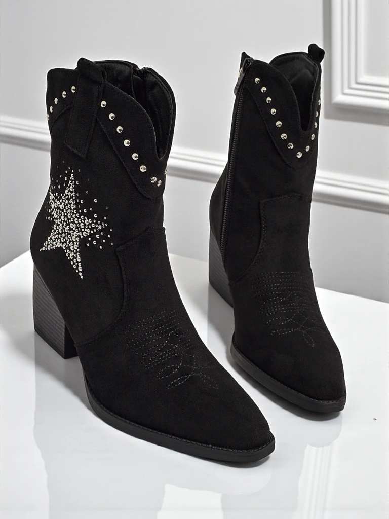 - Ковбойские ботинки на каблуке, выполненные из эко-замши. Тканевая стелька, застегиваются на молнию с декоративной звездой из циркония. Подходят ко многим женственным образам!