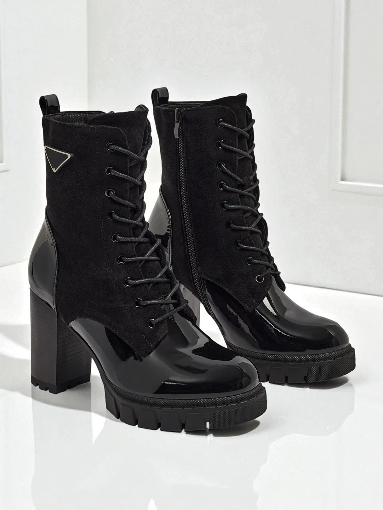 - Удобные ботильоны на каблуке-столбике, выполненные из эко-замши и эко-кожи. Модель на шнуровке и с застежкой-молнией. Идеальный выбор на осень!