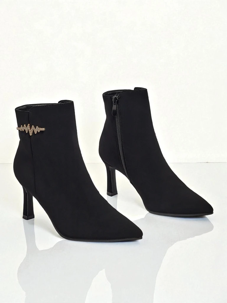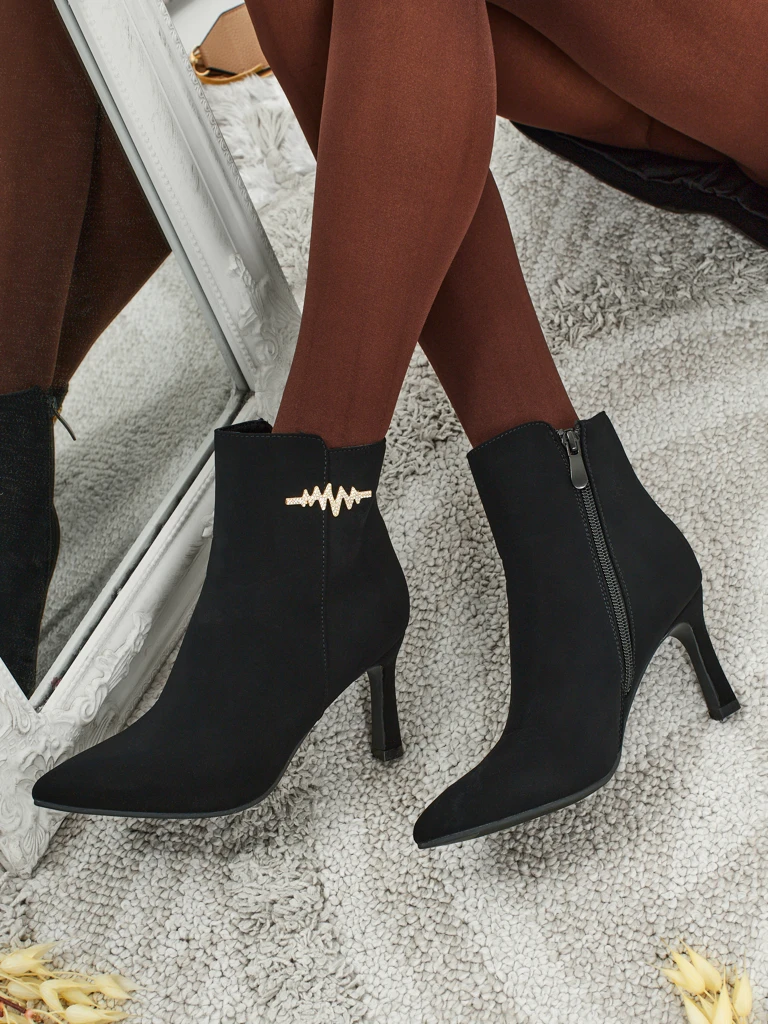 - Стильные женские ботильоны из матовой экокожи - идеальное решение для прохладных дней. Модель застегивается на молнию, имеет утеплитель в виде меха. Модель на шпильке и с заостренным носком. Украшена элементом с цирконами.