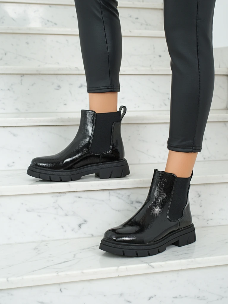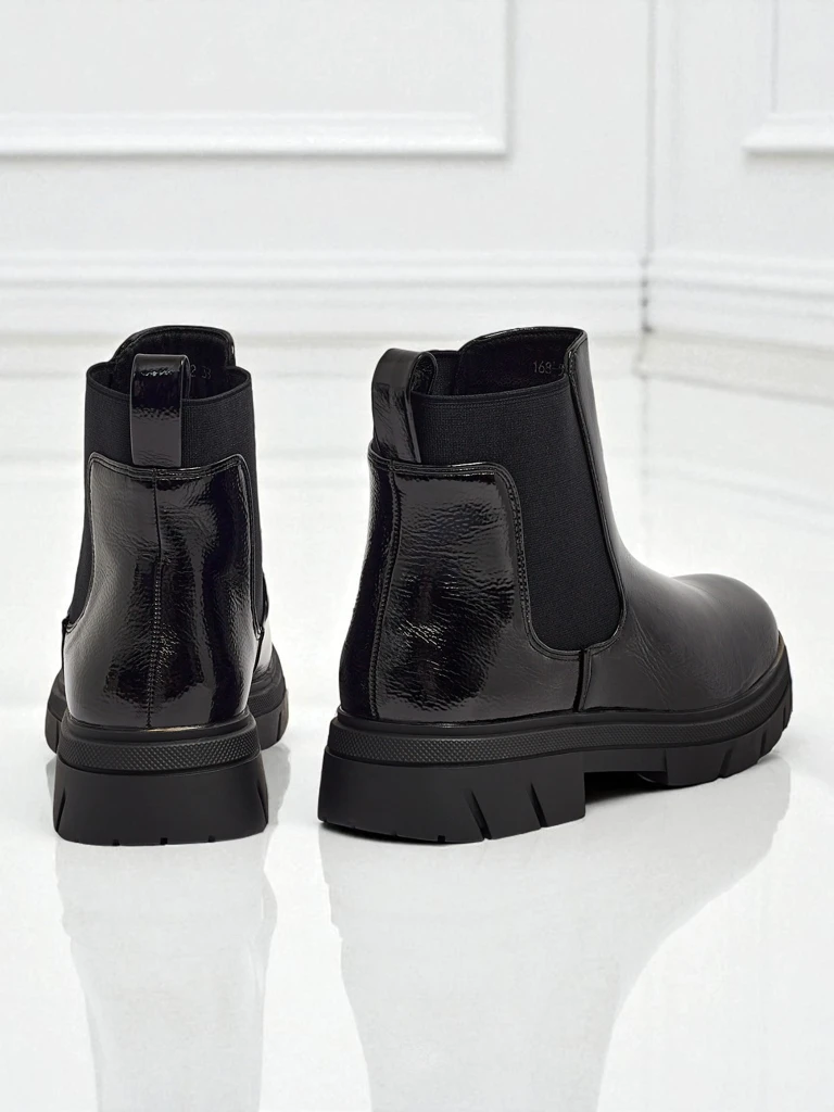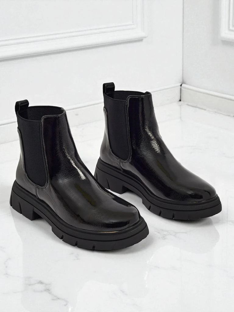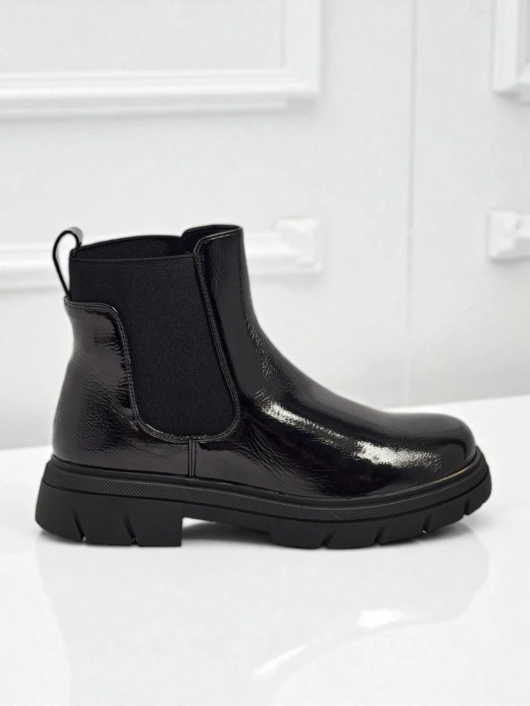 - Превосходные женские ботинки на толстой подошве, изготовлены из лакированной экокожи. Внутренняя отделка из нежного меха гарантирует тепло в прохладные дни. Модель без застежки.