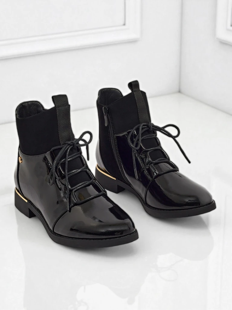 • Женские ботинки из лакированной экокожи с молнией и шнуровкой, с круглым носком - дополнительное утепление в виде меха - современность, удобство и стиль в одном.