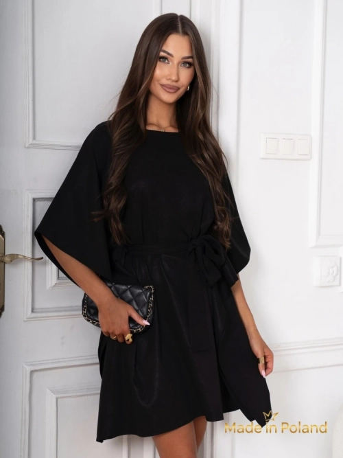 - Krótka, ponadczasowa damska sukienka to połączenie nowoczesnej elegancji i romantycznego stylu. Rękawy 3/4 i falbanki dodają sukience lekkości i wyjątkowej urody. Delikatne wiązanie w pasie podkreśla talię, nadając sukience subtelny kształt.