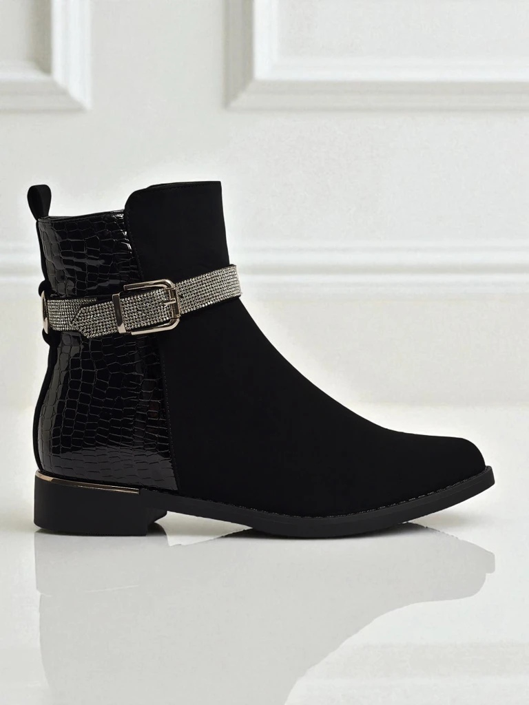 - Женские ботинки на молнии. Модель выполнена из комбинации матовой и лакированной экокожи, на плоской подошве. Имеют утеплитель а-ля мех. Украшены цирконами. Удобные и стильные, идеально подходят для осени!