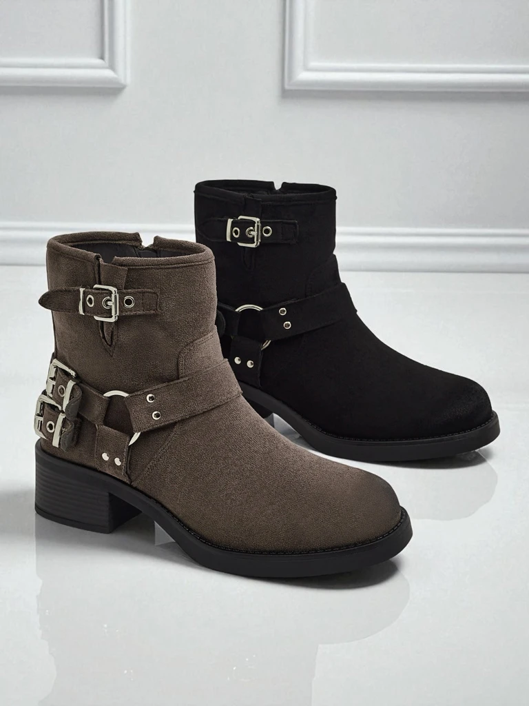 - Женские ботинки из эко-замши с пряжками. Утеплены нежным мехом, застегиваются на молнию. Украшены пряжками. Подходят ко многим женским стилизациям!