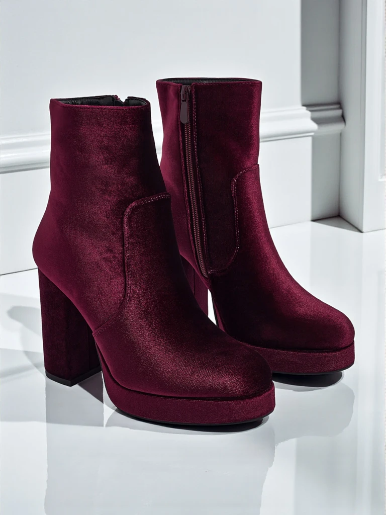 - Удобные ботильоны на каблуке-столбике, выполненные из ткани под велюр. Модель застегивается на молнию. Имеет деликатное утепление в виде меха. Идеальный выбор на осень!
