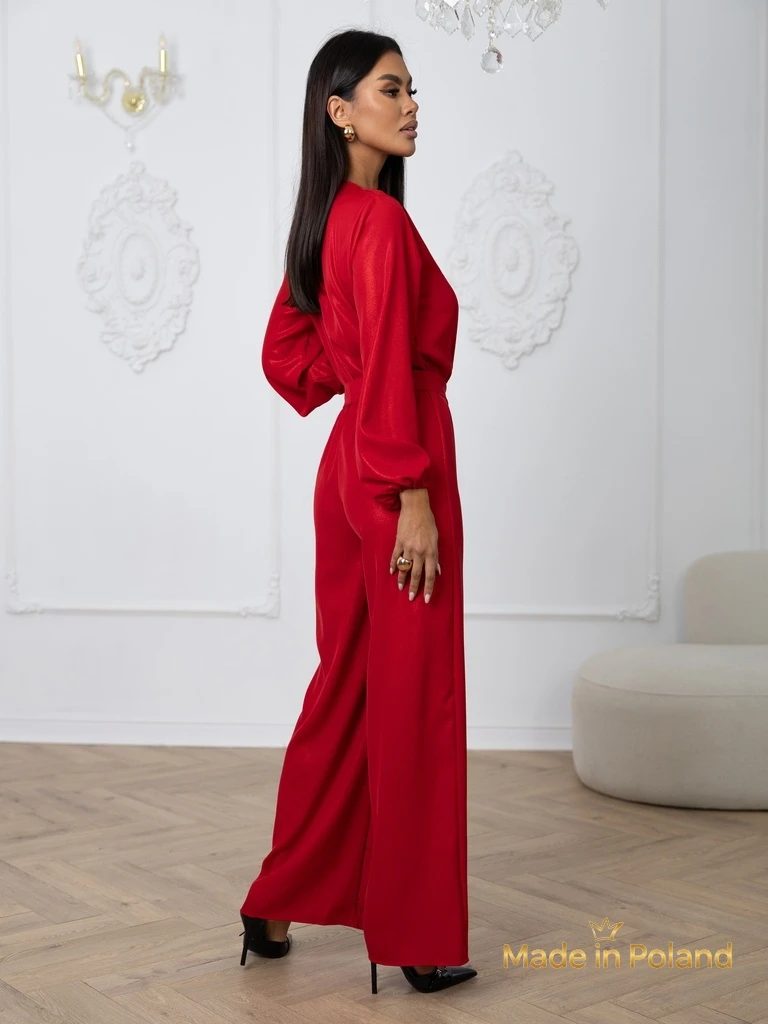 - Элегантный женский комбинезон из приятной ткани с люрексовой нитью. Верх с запахом и длинными рукавами. Широкие брюки с резинкой на талии. В комплекте пояс. Идеально подходит для тех, кто ценит комфорт.