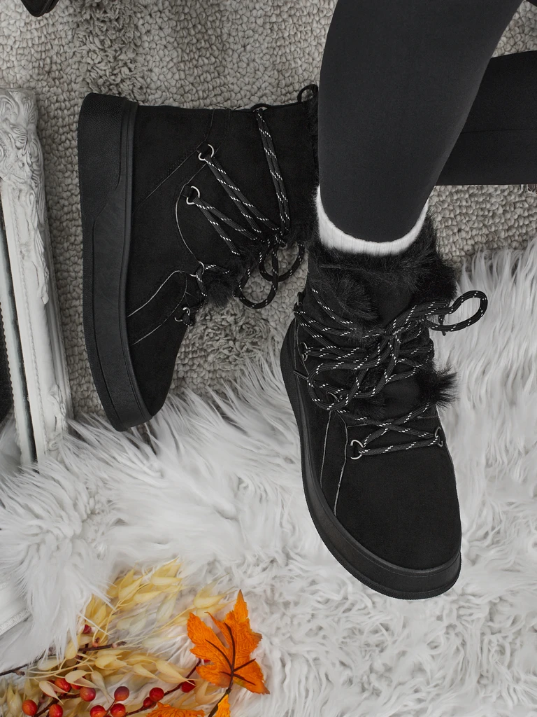 • Отличные женские зимние ботинки-снегоходы на толстой платформе. Верх выполнен из эко-замши, внутри утеплены мехом. Модель на шнуровке. Идеальная база для зимы!