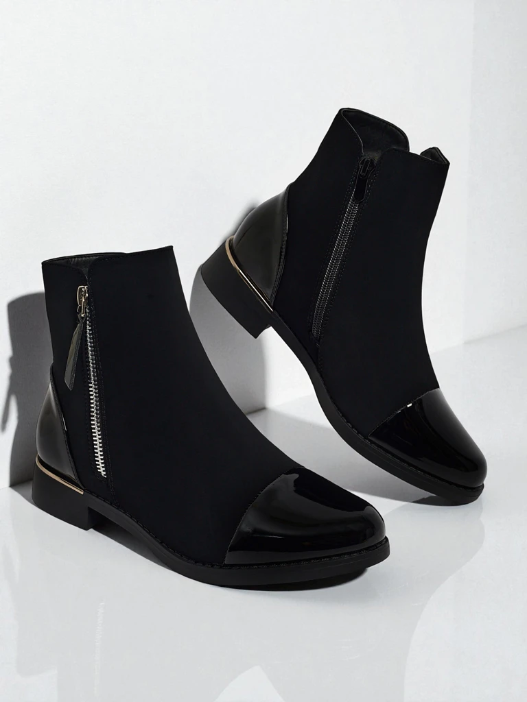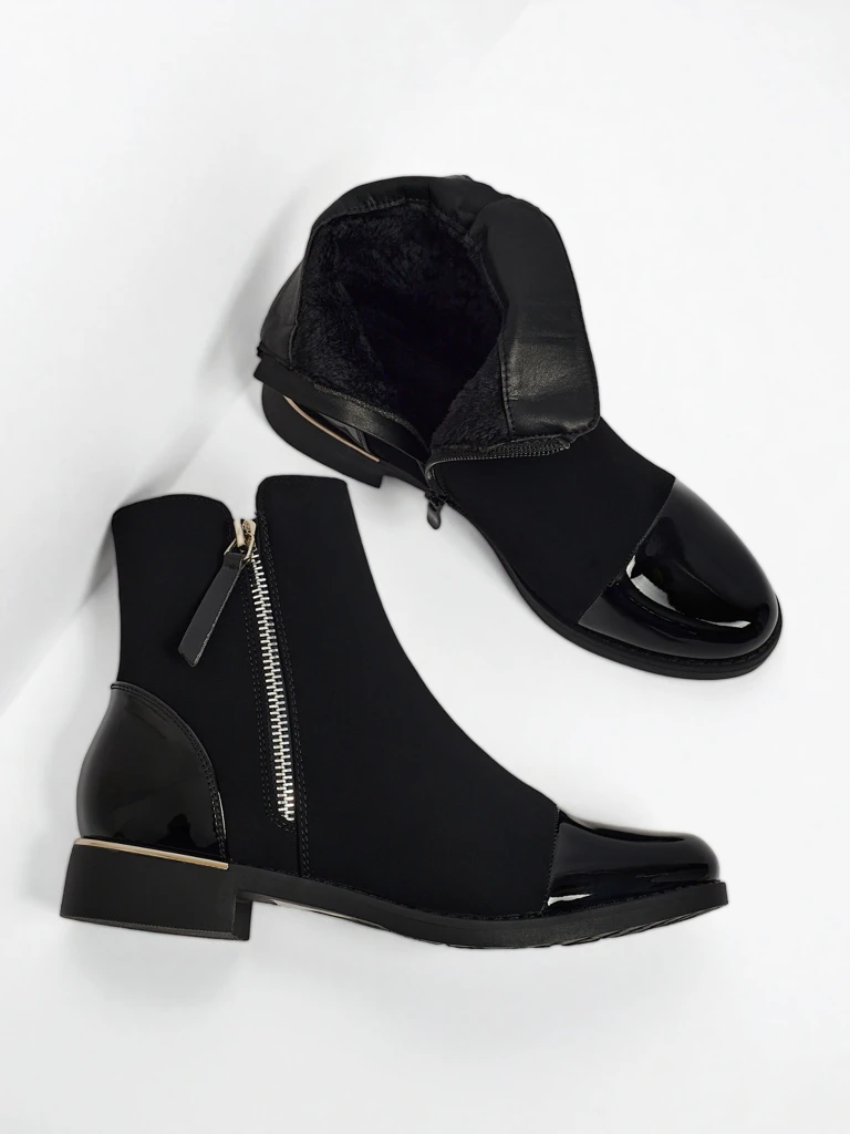 • Превосходные женские ботинки на толстой подошве, выполненные из комбинации лакированной и матовой экокожи. Подкладка из нежного меха гарантирует тепло в прохладные дни. Модель застегивается на молнию.