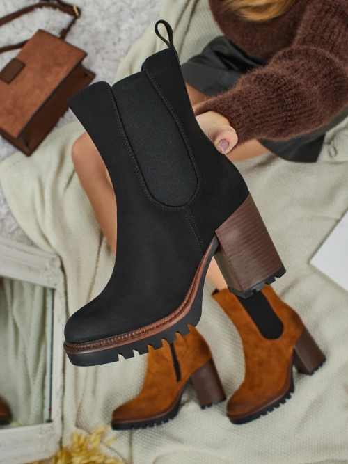 Обувь изготовлена из черной кожи, что придает ей классический вид. Верх дополнен эластичными вставками, что облегчает надевание и снятие. Высокий каблук практически поднимает стиль, обеспечивая при этом устойчивость при ходьбе. Используемые материалы и внимание к деталям делают ботинки не только хорошо выглядящими, но и прочными и устойчивыми к повреждениям.