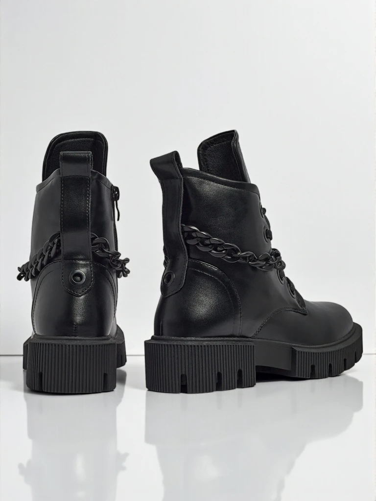 - Женские ботинки из экокожи с молнией, декоративной цепочкой и круглым носком, дополнительно утеплены мехом – современность, удобство и стиль в одном.