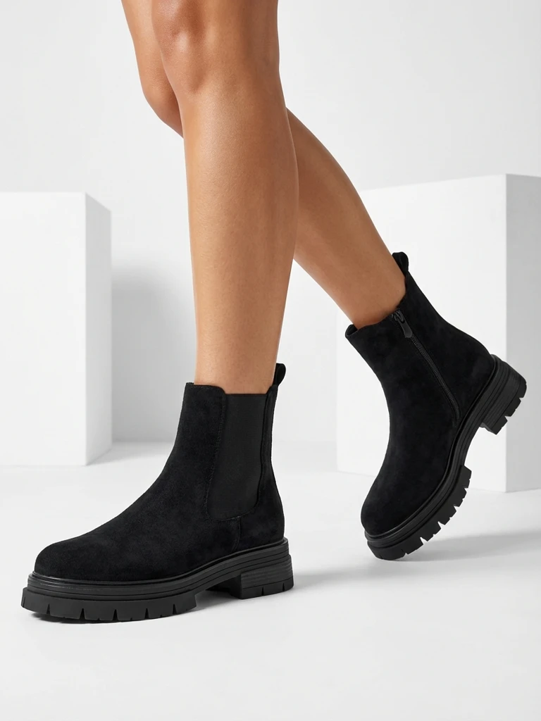 • Красивые и классические ботинки a'la челси на толстой подошве, выполненные из экологичной замши. Внутри утеплены нежным мехом. Отличная база для осенних стилизаций!