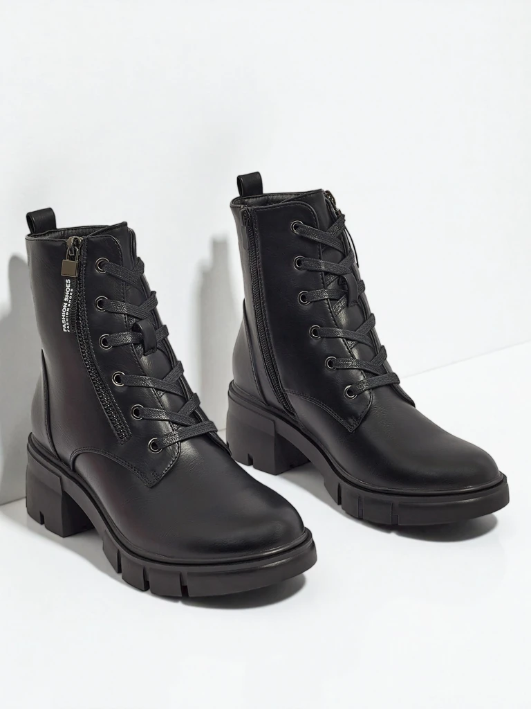 - Женские ботинки из экокожи с молнией, шнуровкой и круглым носком, дополнительно утепленные мехом – современность, удобство и стиль в одном.