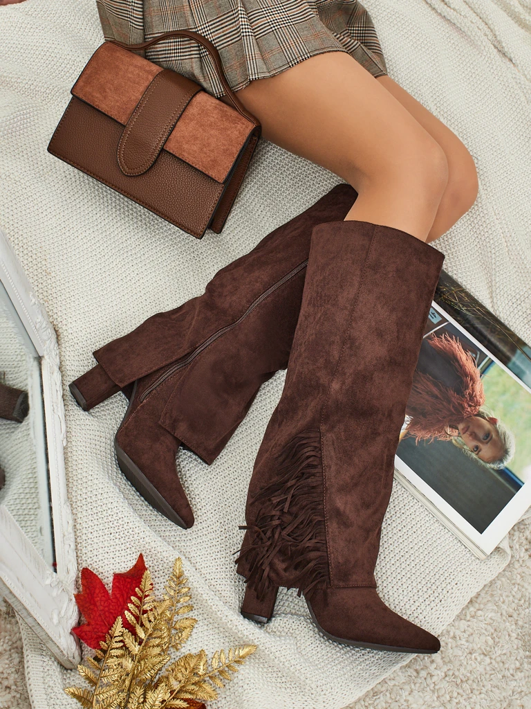 • Женские казаки на каблуке, с заостренным носком, выполнены из эко-замши и дополнены декоративным голенищем с бахромой. Обувь застегивается на молнию, утеплена внутри мехом. Подходят ко многим женским стилизациям!